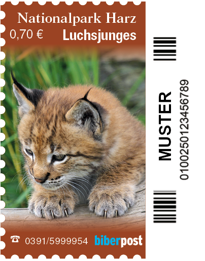 Die Briefmarkenserie „Harz" als Heftchen enthält das Motiv "Luchsjunges" in der der Wertstufe 0,70 € . Diese Marke ist auch auf 30er-Bögen und als Einzelmarke erhältlich.