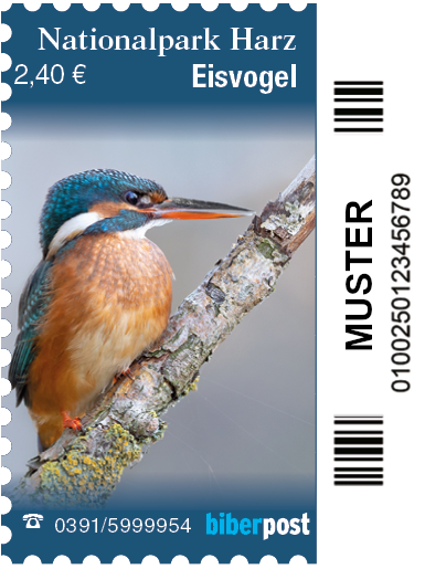 Die Briefmarkenserie „Harz" als Heftchen enthält das Motiv "Eisvogel" in der der Wertstufe 2,40 € . Diese Marke ist auch auf 30er-Bögen und als Einzelmarke erhältlich.