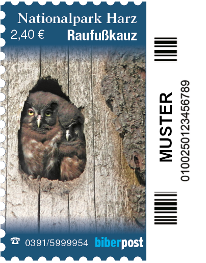 Die Briefmarkenserie „Harz" als Heftchen enthält das Motiv "Raufußkauz" in der der Wertstufe 2,40 € . Diese Marke ist auch auf 30er-Bögen und als Einzelmarke erhältlich.