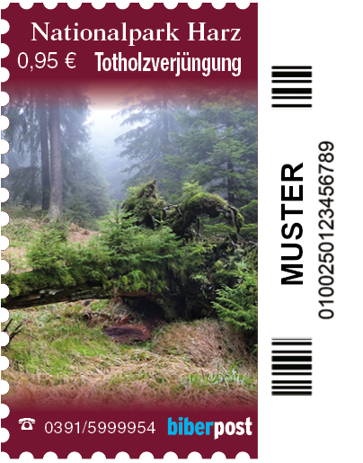 Die Briefmarkenserie „Harz" als Heftchen enthält das Motiv "Totholzverjüngung" in der der Wertstufe 0,95 € . Diese Marke ist auch auf 30er-Bögen und als Einzelmarke erhältlich.