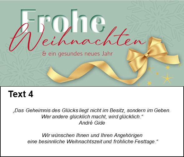 Gestalten Sie hier Ihre ganz persönliche Weihnachtskarte und übermitteln Sie uns Ihre Empfängerliste. Wir produzieren Ihre Karten und stellen sie nach Ihren Wünschen zu.
